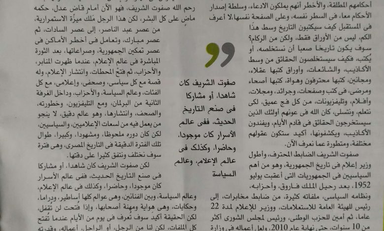 إننا يجب أن ندرس؛ ونعرف أدوار الناس. ومهامهم. عبر تاريخناء حتى لا يكون من بيننا ظالم. أو مظلوم؛ وأن ندرس التاريخ بحكمة؛ وروية؛ ونحكم على كل مرحلة بظروفهاء وتطوراتهاء بحيادية ودقة. أعرف أننى أطلب المستحيل. لكن رحم الله صفوت الشريف؛ وكل من جعلته أقداره. وشخصيته العامة؛ هدفا فى مرحلة التحولات, والبناء الصعبة.
