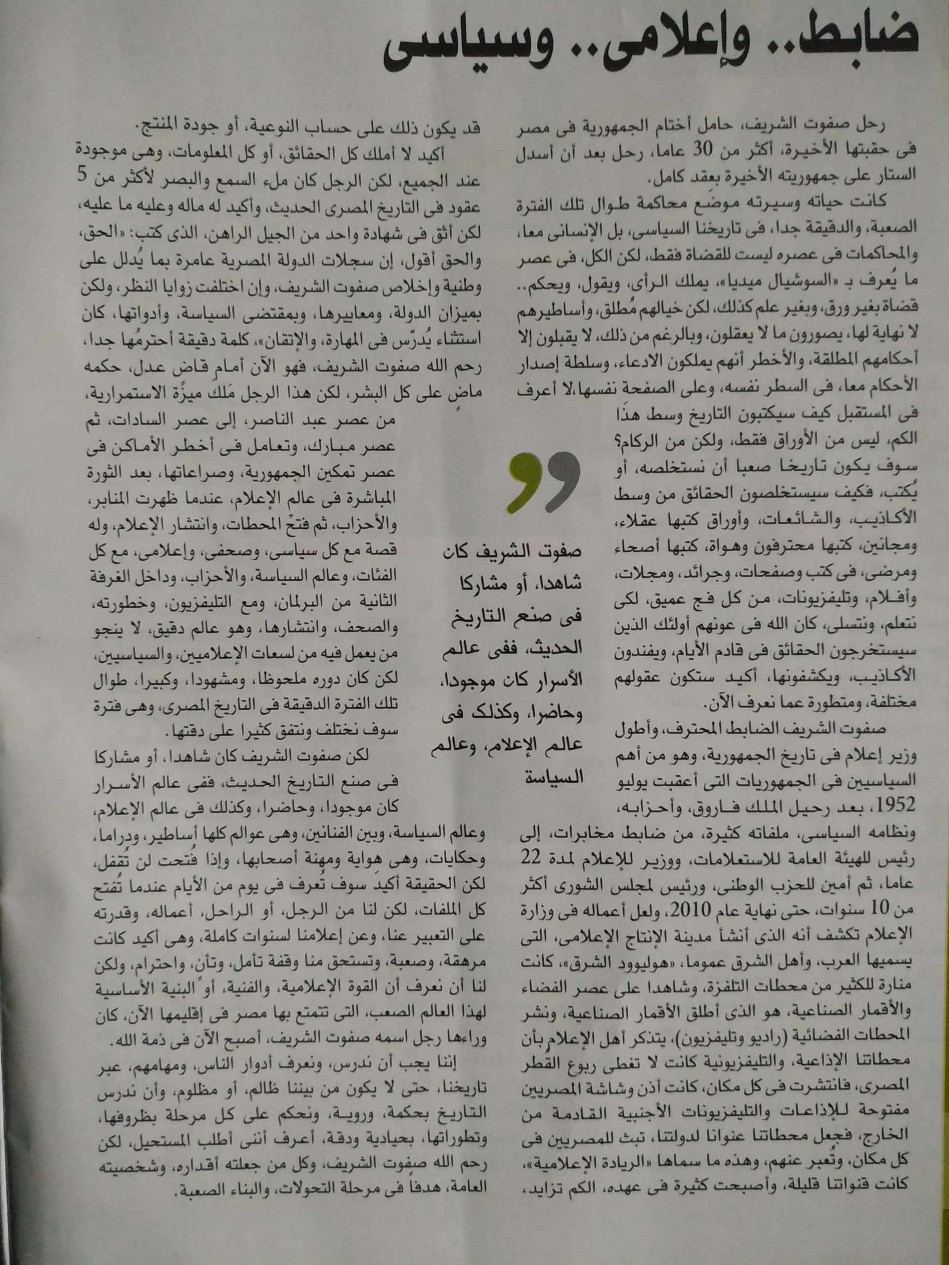 صفوت الشريف الضابط المحترف. وأطول وزير إعلام فى تاريخ الجمهورية. وهو من أهم السياسيين فى الجمهوريات التى أعقبت يوليو 1952 بعد رحيل الملك فاروق, وأحزابه, ونظامه السياسى. ملفاته كثيرة. من ضابط مخابرات. إلى رئيس للهيئة العامة للاستعلامات. ووزير للإعلام لمدة 22 عاما. ثم أمين للحزب الوطنى. ورئيس لمجلس الشورى أكثر من 10 سنوات. حتى نهاية عام 2010. ولعل أعماله فى وزارة الإعلام تكشف أنه الذى أنشاً مدينة الإنتاج الإعلامى. التى يسميها العرب. وأهل الشرق عموما. «هوليوود الشرق». كانت منارة للكثير من محطات التلفزة. وشاهدا على عصر الفضاء والأقمار الصناعية. هو الذى أطلق الأقمار الصناعية. ونشر المحطات الفضائية (راديو وتليفزيون). يتذكر أهل الإعلام بأن محطاتنا الإذاعية. والتليفزيونية كانت لا تغطى ربوع القّطر المصرى,. فانتشرت فى كل مكان. كانت أذن وشاشة المصريين مفتوحة للإذاعات والتليفزيونات الأجنبية القادمة من الخارج. فجعل محطاتنا عنوانا لدولتنا ٠ تبث للمصريين فى كل مكان. وتعبر عنهم؛ وهذه ما سماها «الريادة الإعلامية». كانت فنواتنا قليلة. وأصبحت كثيرة فى عهده. الكم تزايد. قد يكون ذلك على حساب النوعية. أو جودة المنتج.